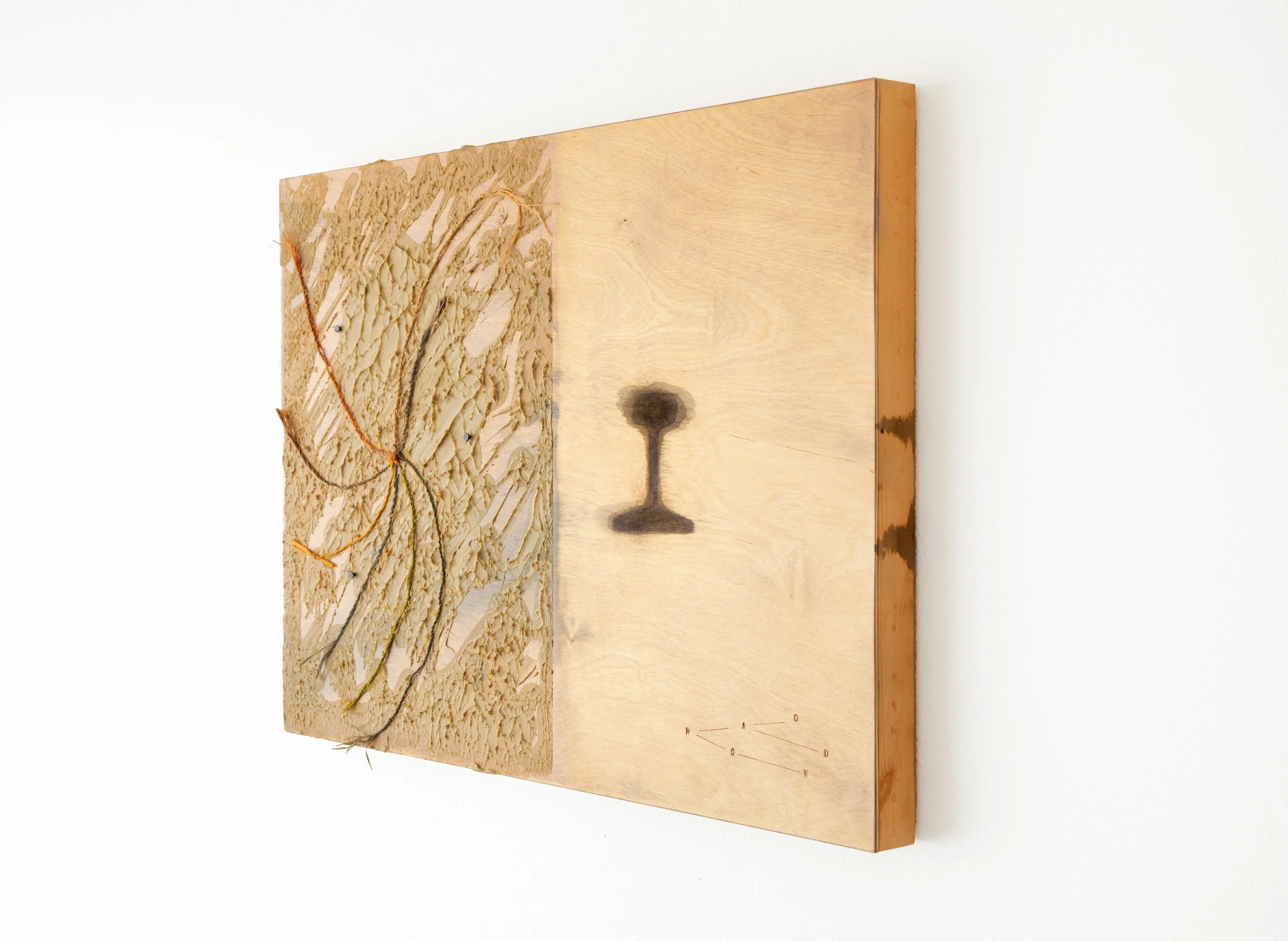 Twisted and dyed hau cordage, nails, liquid nails construction adhesive, rust from a piece of track laid by the Oʻahu Land and Railway Company, acrylic, letter punch on birch plywood panel
